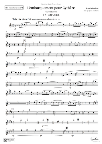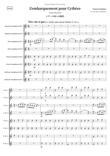 プーランクが2台ピアノのために書いた軽快なヴァルス=ミュゼット。ソプラノ~バリトン各2本、8重奏のアレンジですがラージアンサンブルでも問題なく演奏できます。2分ちょっとの短い曲とはいえ華やか&オシャレな雰囲気で、ステージのオープニングに最適ではないかと思います。原曲から大きな変更はしていませんが、音域やアーティキュレーションなどはこの編成に最適化するべく味付けしてみました。