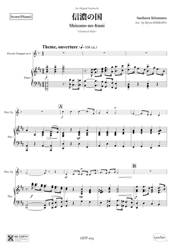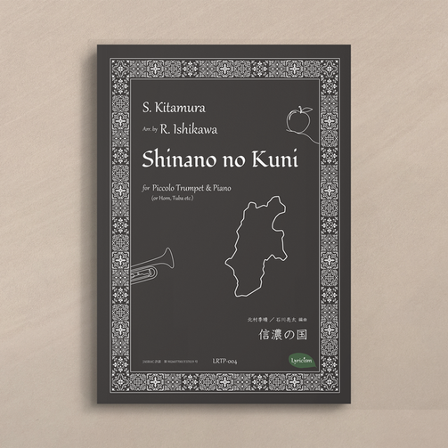ピッコロトランペットとピアノのためのアレンジですが、ホルンやチューバのソロにも最適なのではと思いオプションのパート譜を用意しました。ピッコロトランペットでは効果的と思われる装飾音も、これらの楽器にとっては過剰であるとの考えからその量を減らしてあります。とはいえ、どんな楽器で演奏するにせよ装飾は自由に加えたり減らしたりして構いません。大切なのはいかに様式を楽しみながら演奏するか。ちょっぴり可笑しく、しかしなぜか格調高い信濃の国、ぜひ多くの方にお楽しみ頂きたい!と思います。