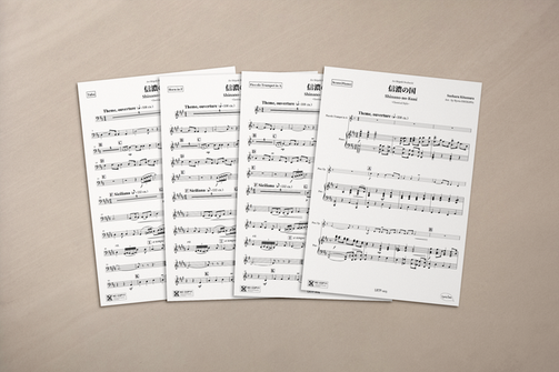 表紙、概要&スコア(8ページ)、パート譜、カラー表紙、in F とin C(へ音記号)のオプションパート譜